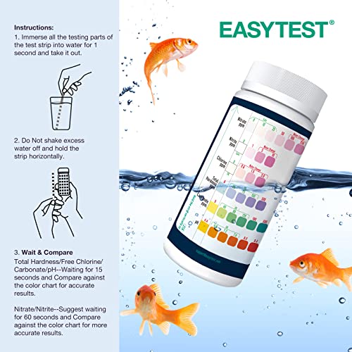 6 IN 1 AQUARIUM WATER TESTING: It is necessary to test water quality in the aquarium regularly and frequently. Nitrate, Nitrite, Total Hardness, Chlorine, Carbonate and pH is the most important parameter to aquarium water upkeep. EASYTEST 6 in 1 aquarium test strips help you test all the important parameters at a time.